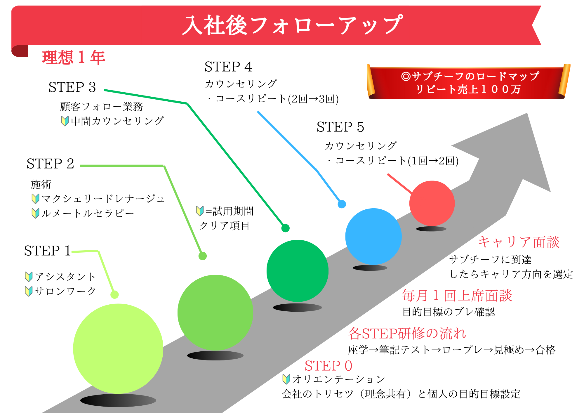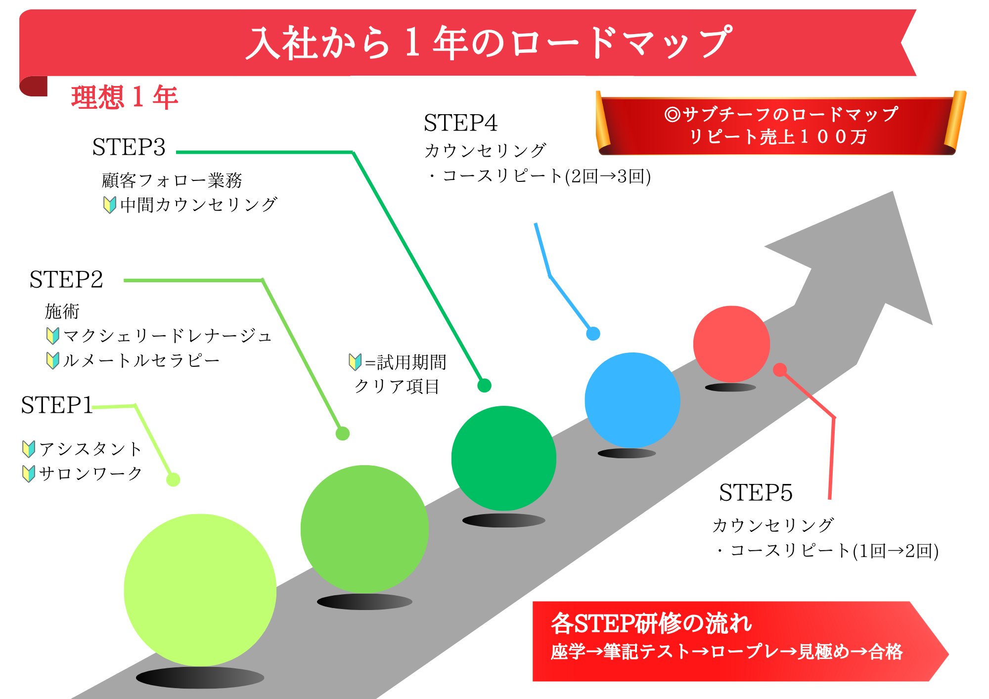 技術も接客もゼロから学べるように、 マニュアル・座学・実技・ロープレ・OJTを段階的に組み合わせた独自の教育プログラムを整えています。